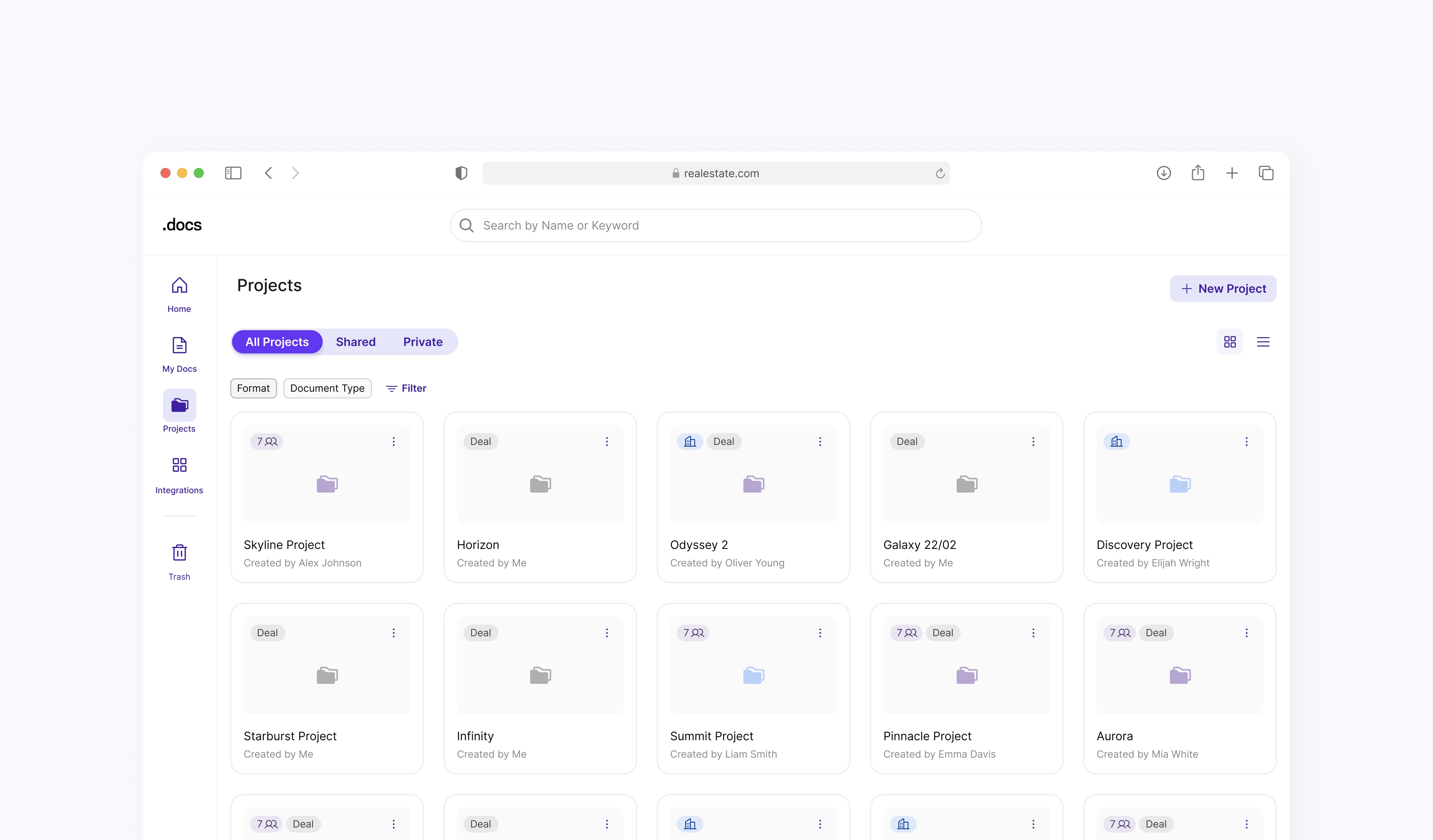 Projects consolidate everything into one structured workspace with flexible privacy options—private, selected users, or org-wide.